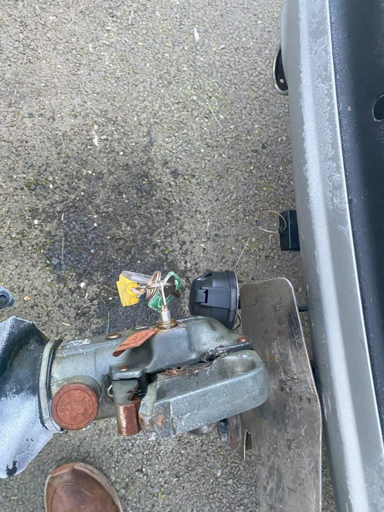 I backed up the wagon to hitch up and to my surprise the hitch lock was frozen and wasn’t budging. Nothing for it but to take the heat gun and thaw it out. After that it was plain sailing on the tow to the slipway until we got to the garage to top off the fuel. The 175 have an inboard tank and there is a plastic hinged cap located midship on the port side. Quick thinking from Paul and he produced a cup of warm water from the coffee machine and we were soon back in business.