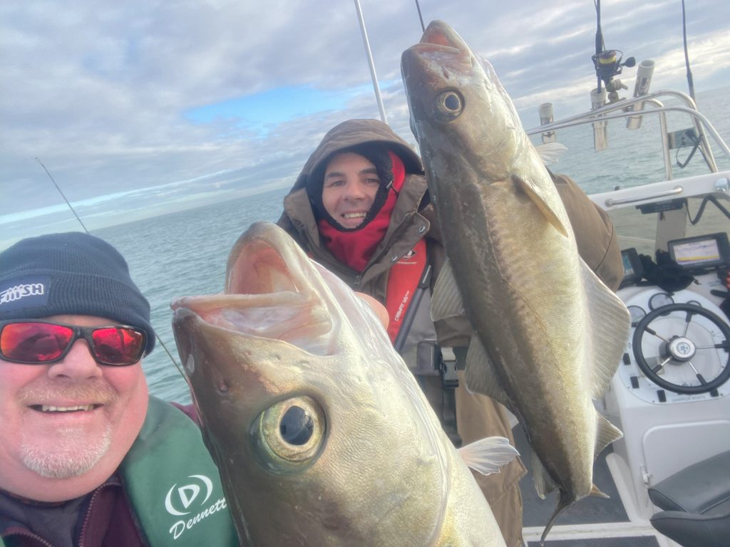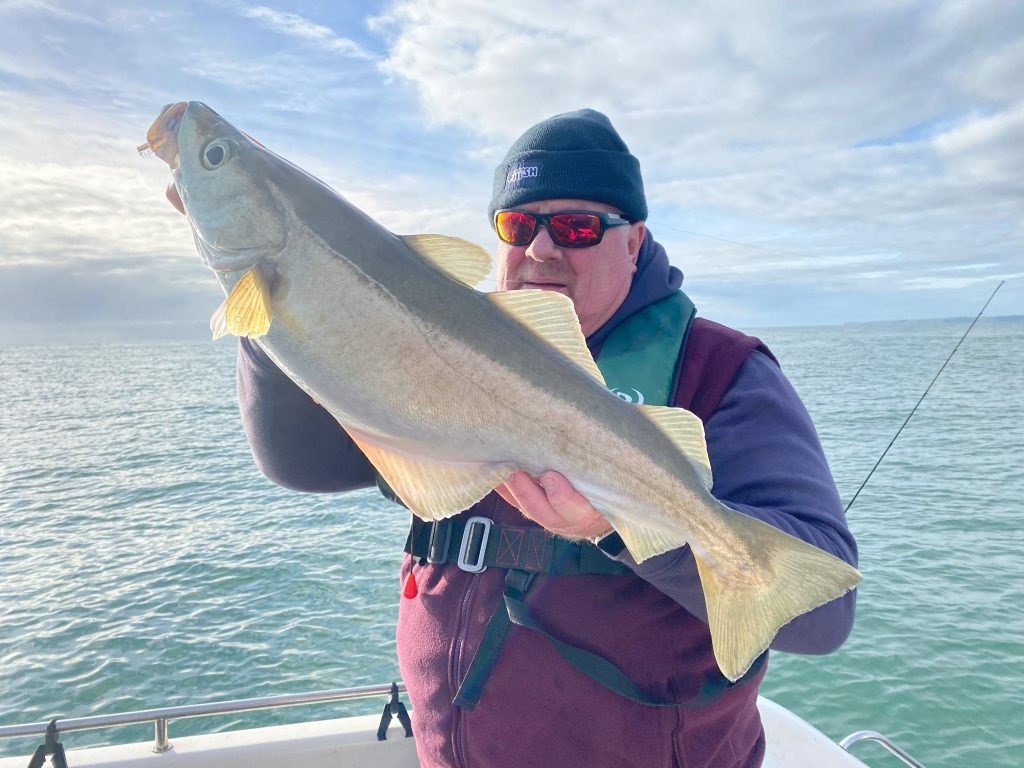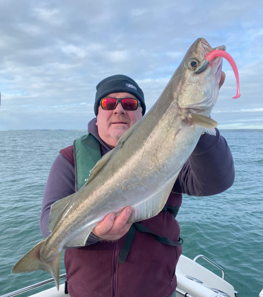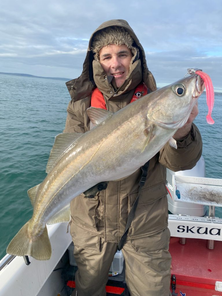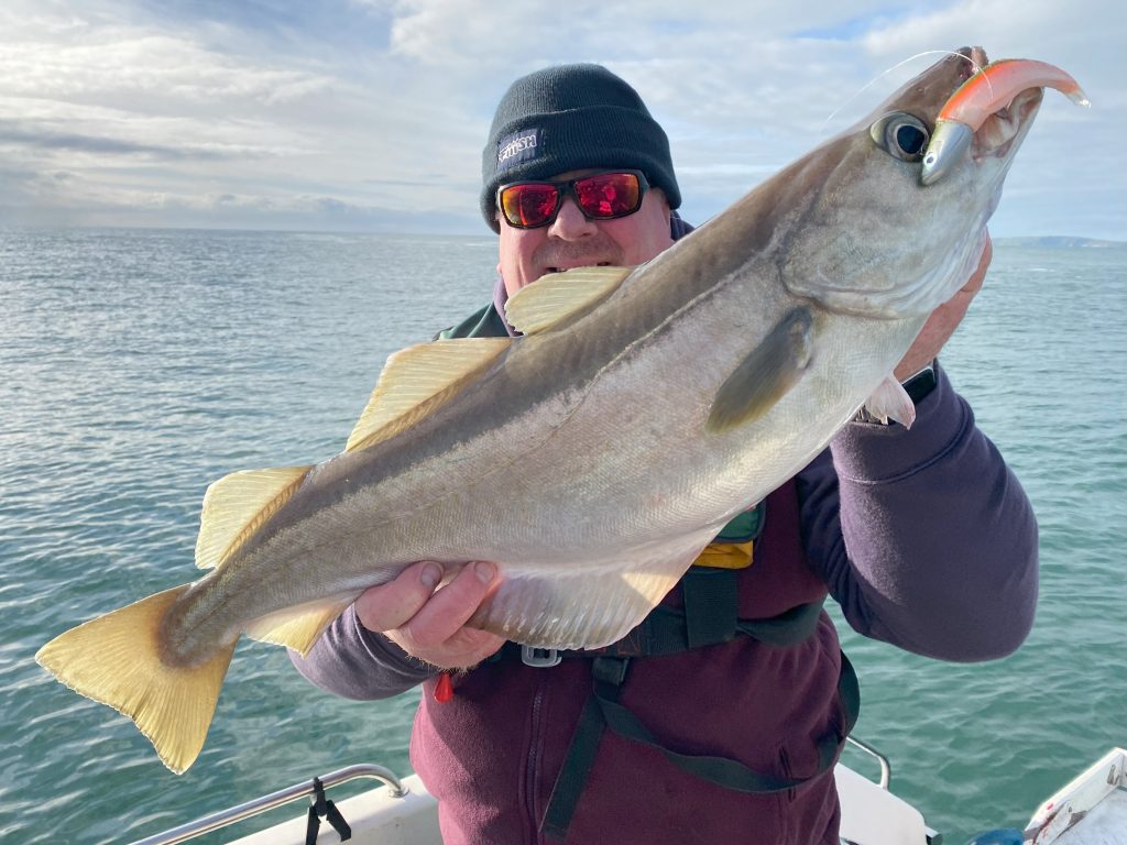 We headed to a patch of reefy ground that we regularly fish and we were quickly into fish. Pollack. They were not high in the water column but were hunkered down on the bottom. We were both inclined to bounce our lures keeping contact with the bottom as this is a sure-fire way to lure a cod. There were no cod around but most of the pollack took the lures off the bottom and fought doggedly to the boat with not so many crash dives that you would be used to.